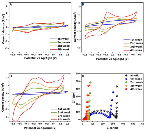 Figure 5). The CV plots show that, within three weeks of the MFC’s operation (that is, from week 2 to week 4), the main peak of current density increased from 0.15 to 0.6, from 0.25 to 1.38, and from 0.8 to 2 (A·m