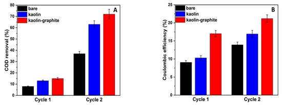 Figure 6A, in all MFCs, there was an upward trend in the during the time of operation. In the second cycle, the MFCs based on the kaolin–graphite anode and the kaolin anode led to COD removal percentages of 72% and 63%, respectively. In comparison, the MFC based on the bare anode led to a COD removal percentage of only 37%.