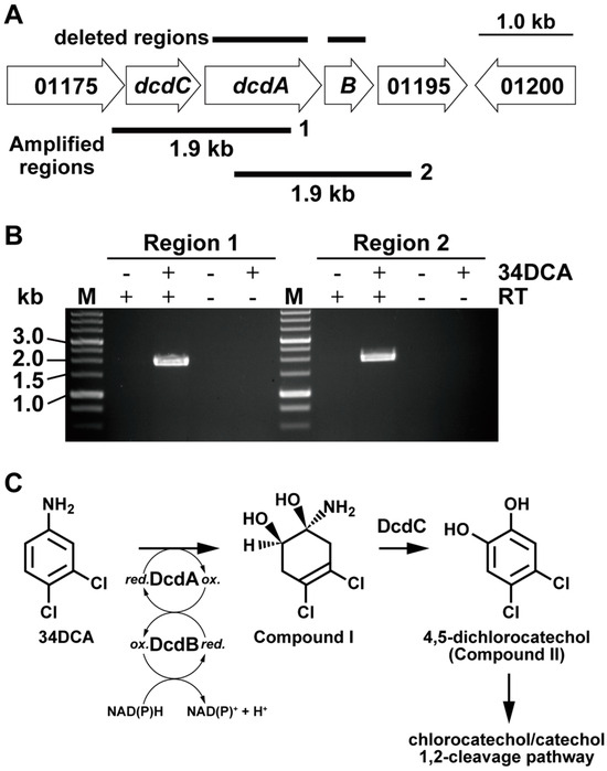 Two pathways have been proposed for the degradation of 34DCA. The first is the pathway in which 34DCA is converted by dechlorination to 4-chloroaniline, which is then metabolized by an aromatic ring cleavage reaction. The other is a pathway in which 34DCA is converted to aniline by two dechlorination steps followed by aromatic ring cleavage and then metabolized [15]. The dehalogenase gene that catalyzes the dechlorination of 34DCA was not identified in the NCBI Prokaryotic Genome Annotation Pipeline. Instead, a cluster that contained genes encoding a putative oxygenase (BEN76_01185) and putative flavin reductase (BEN76_01190) was identified on the chromosome. The BEN76_01185 and BEN76_01190 genes were named dcdA and dcdB, respectively (Figure 1A and Table 1). The elucidated amino acid sequences of dcdA and dcdB had overall similarities of 87% with IifC and 90% with IifD, respectively, which encode an indole hydroxylase oxygenase and reductase from Acinetobacter sp. strain O153, respectively [27]. The identified amino acid sequence of BEN76_RS01180 (dcdC), located upstream of dcdA, was similar to that of a short-chain dehydrogenase (IifB) in strain O153, suggesting that this gene is involved in the dehydrogenation reaction. Based on their amino acid sequence similarities, these genes may be involved in the dioxygenation of 34DCA and subsequent dehydrogenation of the diol compound to dichlorocatechol (Figure 1C). The amino acid sequences of BEN76_RS01175 and BEN76_RS01195, located near the dcd genes, were similar to those of the dienelactone hydrolase family protein (IifA) and phenol degradation protein (IifE), respectively.