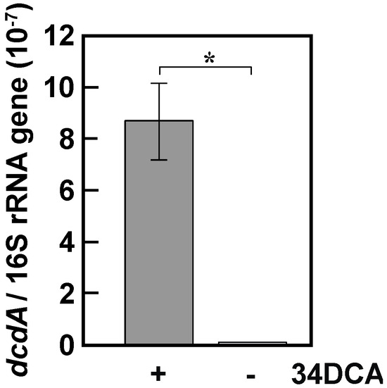 To investigate the transcriptional induction of the dcd operon, qRT-PCR was performed using a primer set designed to amplify the internal region of dcdA. Total RNA was extracted from GFJ2 cells grown on succinate with or without 34DCA. The levels of dcdA mRNA were significantly higher in cells grown in the presence of 34DCA than in cells grown without 34DCA (p < 0.05, Student’s t-test; Figure 2). This result suggests that the transcription of the dcd operon is induced during growth on 34DCA and that this operon is involved in 34DCA degradation.