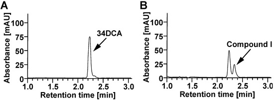 Degradation of 34DCA by resting cells of GFJ2. A reaction mixture containing 100 µM 34DCA and the resting cells of GFJ2 (OD600 = 4.0) was incubated at 30 °C. HPLC chromatograms of the reaction mixture at the start and after 6 h of incubation are shown in panels (A,B), respectively.