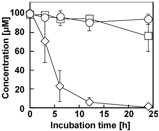 To determine the functions of the dcdA and dcdB gene products, the resting dcdA- or dcdA-dcdB plasmid-carrying E. coli cells were incubated with 100 µM 34DCA, and the reaction mixtures were analyzed using HPLC. No conversion of 34DCA was observed in the reaction mixture expressing dcdA (Figure 5A). In contrast, 34DCA levels remarkably decreased after 3 h of incubation with E. coli cells expressing both dcdA and dcdB (Figure 5A). Compound I was also generated in the same reaction mixture (Figure 5B). Compound I disappeared after 24 h (Figure 5B), suggesting that it is an unstable intermediate metabolite generated from 34DCA. These results indicate that the gene products of dcdA and dcdB are directly involved in the conversion of 34DCA to compound I.