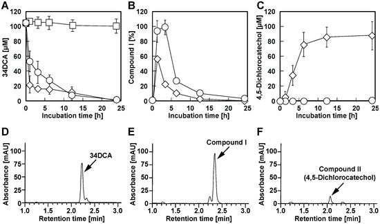 Degradation of 34DCA by the resting cells of E. coli expressing dcdA (squares), dcdA-dcdB (circles), and dcdA-dcdB-dcdC (diamonds). (A–C) 100 μM 34DCA along with the resting cells of E. coli containing the dcd genes (OD600 = 4.0) were incubated. The concentration of 34DCA and compounds I and II (4,5-dichlorocatechol) were determined by performing HPLC analysis. The values represent the averages ± standard deviations of three independent experiments. (D–F) HPLC chromatograms of the reaction mixture of the resting cells of E. coli expressing dcdA, dcdB, and dcdC at the start and after 1 and 12 h of incubation are shown in panels d, e, and f, respectively. The concentrations of 34DCA and 4,5-dichlorocatechol were determined from a calibration curve created from the area of the standard substance at the specified concentrations. The amount of compound I was calculated as a relative value, using the area at the time of greatest accumulation as 100%.