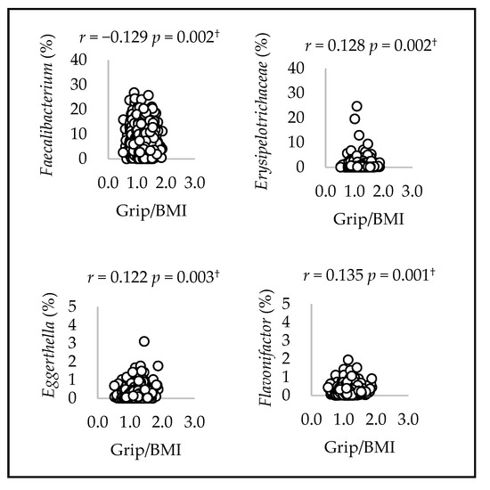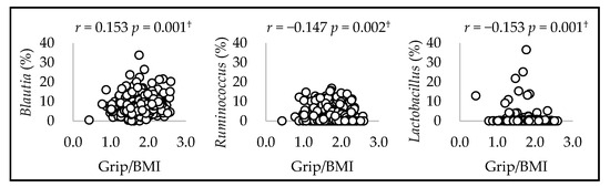 Spearman’s correlation between mean relative counts and grip/BMI of the fourth genera in women. † p-values that passed the FDR 0.05 threshold.