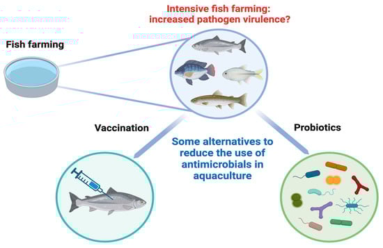 During the development of aquaculture, one of the key problems has been the incidence of pathogens. The most prevalent ways to combat infections have been chemical agents and antibiotics []. However, in recent years the use of antibiotic treatments has been questioned and restricted in several countries, due to their bio-accumulative effects and the increase in bacterial antibiotic resistance with detrimental consequences on human and animal health [,]. Some of the alternatives to the excessive use of antibiotics in order to deal with pathogens in aquaculture are vaccination and the use of probiotic strains (Figure 1). Indeed, the food and agriculture organization of the united nations (FAO) and the World Health Organization (WHO) have defined probiotics as “live microorganisms, which, when administered in adequate doses, confer benefits to the health of the host” []. Taking into account the variations in terrestrial and aquatic animal life, Merrifield et al. 2010 introduced a variation of the term probiotics with a focus on aquaculture, defining a probiotic as “an organism that can be considered alive, dead or a component of a microbial cell, which administered via feed or rearing water, benefiting the host by improving disease resistance, health status, growth performance, feed utilization, stress response, or general vigor, which is achieved at least in part by improving the microbial balance of the host or the microbial balance of the environmental setting” [].
