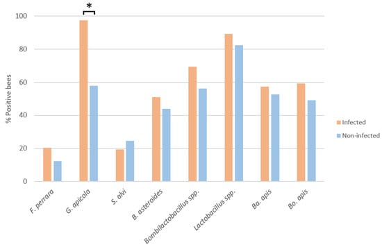 Percentage (%) of bees positive for each gut bacterial species in infected and non-infected bees, irrespective of age. * Statistically significant difference (p < 0.05).