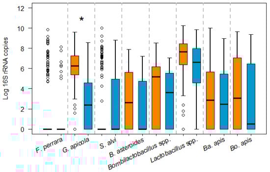 Box-plots showing the absolute abundance of the 16S rRNA genes for the different gut bacteria analysed in N. ceranae-infected (orange) and non-infected bees (blue). The line represents the median, while the box represents 50% of the observations and the whiskers reach the interquartile range of 1.5×. When the distribution of samples does not enable boxes to be established, the bacteria are represented by circles. For pairwise comparisons, the Games–Howell post hoc test was used: * p < 0.05.