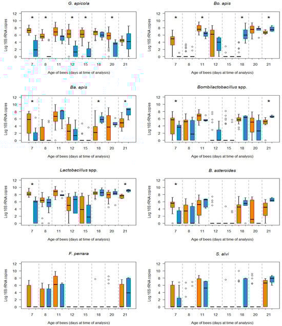 Box-plots showing the absolute copy number abundance of the 16S rRNA gene for the different gut bacteria analysed in N. ceranae-infected (orange) and non-infected (blue) bees at each age, from the highest to lowest differences. The line represents the median, while the box represents 50% of the observations and the whiskers reach the interquartile range of 1.5×. When the distribution of samples does not enable boxes to be established, the bacteria are represented by circles. The Mann–Whitney test was used for pairwise comparisons: * p < 0.05.