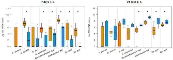 Box-plots showing the absolute abundance of 16S rRNA gene copy number of the different gut bacteria analysed in 7-day-old (left) and 21-day-old (right) N. ceranae-infected (orange) and non-infected bees (blue). The line represents the median, while the box represents 50% of the observations and the whiskers reach the interquartile range of 1.5×. When the distribution of samples does not enable boxes to be established, the bacteria are represented by circles: * p < 0.05.