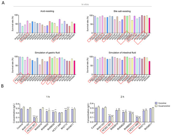 Screening lactic acid bacteria in vitro. (A) Tolerance to a simulated gastrointestinal environment of the 23 strains. (B) The content of inosine and guanosine after 1 h and 2 h culture with different probiotics. One-way ANOVA Tukey’s multiple comparisons test was performed. * p < 0.05, ** p < 0.01, and *** p < 0.001. The red boxes indicate the strains that performed well in this test.