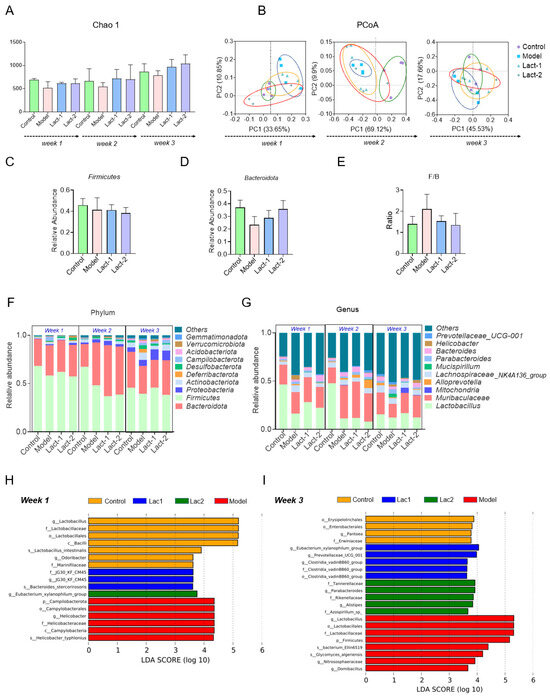 Effect of Lact-1 and Lact-2 on remodeling the gut microbiota. (A) The Chao1 index showing alpha diversity. (B) Principal component analysis (PCoA) plot showing the beta diversity. (C) The relative abundance of Firmicutes at the phylum level. (D) The relative abundance of Bacteroidota at the level of phylum. (E) The ratio of the relative abundances of Firmicutes and Bacteroidota (F/B). (F) Abundance distribution at the phylum level. (G) Abundance distribution at the genus level. (H) LEfSe analysis identified the most differentially abundant taxons. LDA scores of >4 are shown after the first week. (I) LEfSe analysis identified the most differentially abundant taxons. LDA scores of >4 are shown after the third week.
