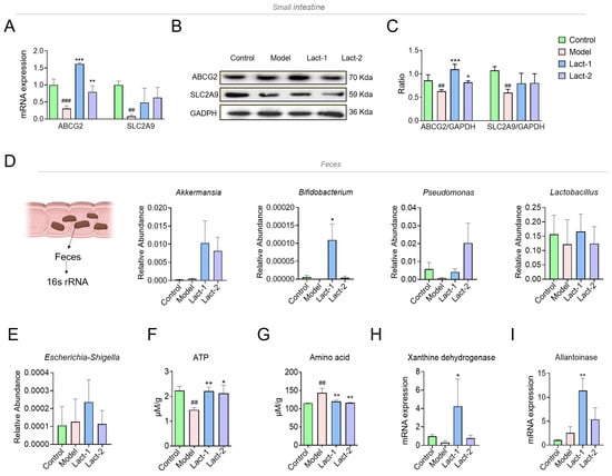Effect of Lact-1 and Lact-2 on UA transporter and gut microbiota derivatives. (A) The mRNA expression of ABCG2 and SLC2A9 in the small intestine. (B) The expression and phosphorylation levels of proteins involved in the ABCG2 and SLC2A9 pathways were determined using Western blot analysis. GAPDH expression was detected as an internal control. (C) The mRNA expression of ABCG2/GADPH and SLC2A9/GADPH. (D) The relative abundance of Akkermansia, Bifidobacterium, Pseudomonas, and Lactobacillus in feces. (E) The relative abundance of Escherichia-Shigella in feces. (F) Fecal ATP level. (G) Fecal amino acid level and data were analyzed using the colorimetric method. (H) The mRNA expression of Xanthine dehydrogenase. (I) The mRNA expression of Allantoinase. The ‘#’ symbol shows comparisons between the control and model groups; ## p < 0.01, and ### p < 0.001. Significance levels for comparisons with other groups compared to the model group were indicated as * p < 0.05, ** p < 0.01, and *** p < 0.001.