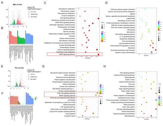 Human Colon Cancer Cells (HT-29) are stimulated by Lact-1 and its metabolites; differential expression analyses of metabolites vs. control and probiotics vs. control were performed. The data showed that 1972 genes were upregulated and 496 genes were downregulated, whereas, in probiotics vs. control, 677 genes were upregulated while 483 genes were downregulated (Figure 5A,C).