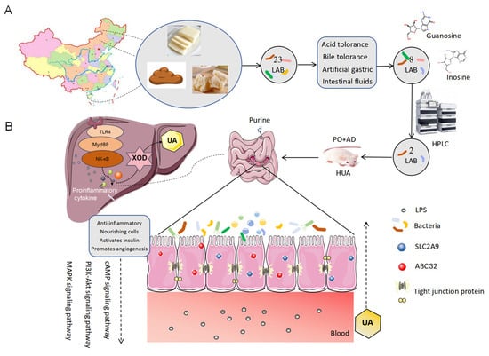 Gut microbiota is closely linked to many diseases and plays a crucial role in the metabolism of purines and UA. Gout patients’ gut microbiomes are distinct, showing a marked decline in bacteria that express the uricase gene. Additionally, the changed gut microbiota affects the expression of UA transporters in the intestine, including ABCG2 and GLUT9, as well as the ongoing inflammatory response, both of which aid in the development of hyperuricemia [14,15,16]. Therefore, it is possible to utilize probiotics to reduce hyperuricemia and the inflammatory damage brought on by urate in urine. Numerous strains of Lactobacillus have been identified by researchers to lower SUA levels. For instance, L. fermentum JL-3 from the traditional Chinese cuisine “Jiangshui” degraded UA in vitro and reduced hyperuricemia in mice [17]. L. gasseri PA-3 can directly use AMP, IMP, and GMP for growth and reduce rat purine absorption [18,19]. L. rhamnosus 1155 and L. fermentum 2644 were isolated from traditional fermented products and showed capability against purine nucleoside and the prevention of hyperuricemia [20]. L. Paracasei extracted from traditional pickles degraded nucleosides in vitro and UA in vivo, alleviating kidney damage in a rat model of chronic hyperuricemia [21]; other strains of L. paracasei X11 restored intestinal microbiota and reduced UA in hyperuricemia mice [22]. The study reported that potential probiotics L. paracasei MJM60396 can prevent hyperuricemia by absorbing purines, inhibiting xanthine oxidase, increasing UA excretion, and modulating urate transporters in mice [23]. L. reuteri strain TSR332 and L. fermentum strain TSF331 effectively reduced hyperuricemia and stabilized UA levels in rats [24]. However, these studies only focused on the degradation of purines and nucleosides in the screening of strains, without paying attention to the gastrointestinal tolerance of the strains and whether they have probiotic potential.