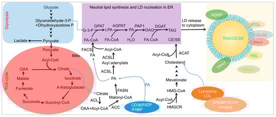 The biogenesis of LDs involves an enzyme-driven lipid anabolism initiated by the CD36-mediated uptake of fatty acids (FAs) from nutrition [15,16,17] under fed conditions; this process leads to the synthesis of TAG within the two layers of the membrane of the ER [18,19,20]. The uptake of fatty acids from nutrition also requires plasma membrane-bound proteins such as FA binding proteins (FABPs) and fatty acid transport proteins (FATPs) [21]. The FAs can also be synthesized from the glycolysis pathway inside of cells (blue box of Figure 1), the tricarboxylic acid (TCA) cycle in the mitochondrion (pink oval of Figure 1), and FA formation in the cytosol from citrate. The formation of LDs encompasses three biological processes in cells: the synthesis of neutral lipids, including TAG and CE, in the ER, the nucleation of neutral lipid and perilipin proteins in the ER, and the release of LDs from the ER to the cytosol (Figure 1). The synthesis of TAG from glycerol-3-phospholipid (G-3-P) involves four steps following the Kennedy pathway (purple box of Figure 1) [22,23].