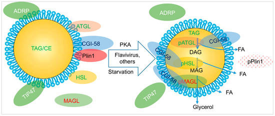 Lipolysis of LDs: Perilipin 1 (Plin1) binds with CGI-58 to keep it away from ATGL, HSL, and MAGL so that the lipases are at an inactive state and LDs maintain intact (left); several conditions such as starvation, viral infection, the demanding of membrane generation, and stress activate PKA that phosphorylates Plin1, leading its degradation (right). In this case, CGI-58 is freed to bind ATGL, HSL, and MAGL causing their phosphorylation and activation to enter the LD core to lysate TAG and DAG to release FAs and from MAG that is catalyzed to produce glycerol and FAs. Abbreviations. pPlin, phosphorylated Plin; PKA, protein kinase A.