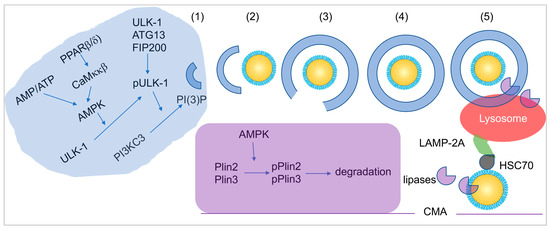 Lipophagy of LDs. Upper panel. Macrophagy of LD lipophagy: (1) Preautophagosome assembly, initiation site of phagosome formation with molecular activation cascade (blue box). (2) phagophore membrane expansion to surround LDs, (3) vesicle elongation, (4) vesicle nucleation to form closed autophagosome, and (5) fusion of matured autophagosomes with lysosome. Lower panel. Chaperone-mediated autophagy depends on interactions of LAMP2A and HSC70, resulting in degradation of Plin2 and Plin3 (purple box) and LDs. Abbreviations. AMPK, AMP-activated protein kinase; AMP, adenosine monophosphate; ATP, adenosine triphosphate; PPAR, peroxisome proliferator-activated receptor; CaMKKβ, Ca(2+)/CaM-dependent protein kinase kinase β; ULK-1, Unc-51-like kinase 1; PI3KC3, phosphatidylinositol (PI)3-kinase complexes 3; PI(3)P, Phosphatidylinositol 3-phosphate; LAMP-2A, lysosome protein 2A; CMA, chaperone-mediated autophagy; HSC70, Heat shock cognate 71 kDa protein.