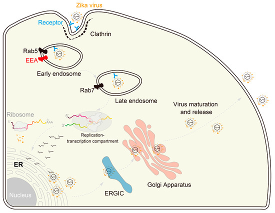 Zika virus replication cycle. ZIKV entry, trafficking to ER for viral replication, assembly, and maturation in Golgi apparatus and release outside of cells.