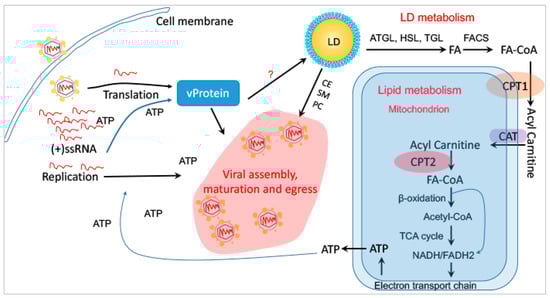 The replication, gene expression, particle assembly, and maturation of viruses involve intricate biological and chemical reactions within infected cells, all of which require energy in the form of ATP. Flaviviruses, being enveloped, particularly necessitate a significant amount of lipid for the formation of viral envelopes. In this context, LDs play a pivotal role as they can supply both ATP and lipids, making them a crucial target for viral interactions post-infection. The relationship between LDs and RNA viruses, including Flaviviruses, encompasses several steps of interactions. Although the specific details may vary among different RNA viruses, a generalized mechanism can be outlined: