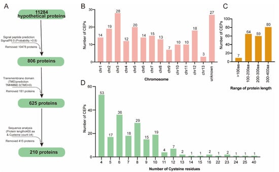 All candidate CEPs were distributed on all chromosomes according to genome location analysis (Figure 1B). Of the 210 CEPs, 38.09% (80 sequences) had a size between 300 and 400 amino acids; 3% had a size less than 100 amino acids (Figure 1C). Based on statistical analysis, 89% of the 210 final CEPs contained fewer than 10 cysteines, while 25% contained at least 4 cysteines (Figure 1D). Notably, one CEP (KUI69483.1) contained 40 cysteines.