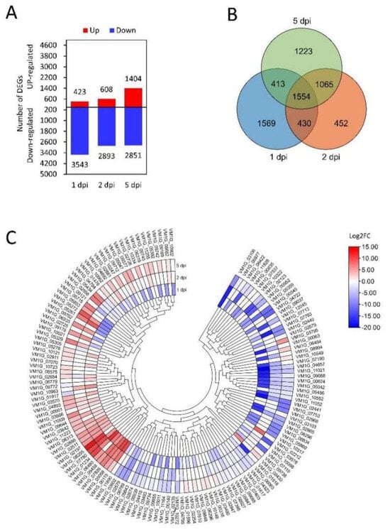 Expression profiles of V. mali genes during the infection of M. sieversii. (A) Amount of differential gene expression. (B) Venn diagram of the differentially expressed genes at the different time points. (C) Expression heat map of differentially expressed CEP-encoding genes. Each panel shows a single sample, and each cell shows the relative expression level for a single gene. Expression levels were indicated by color gradient, with red and blue representing upregulation and downregulation, respectively.