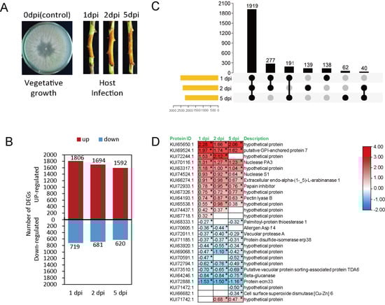 The proteomic analysis was performed on branches of M. sieversii infected with V. mali after 1, 2, and 5 days post infection. As a control, the V. mali fungus was grown on PDA medium. (Figure 3A). Proteome data were generated by Tandem Mass Tags techniques. The proteomic data analysis revealed that 7112 fungal proteins were differentially expressed (p < 0.05, |log2 foldchange| > 0) during infection. (Figure 3B,C). Most of the proteins were differentially expressed in the early stages of infection (Figure 3B). In all infection stages, 1919 proteins were found to be common in 1, 2 and 5 dpi (Figure 3C).