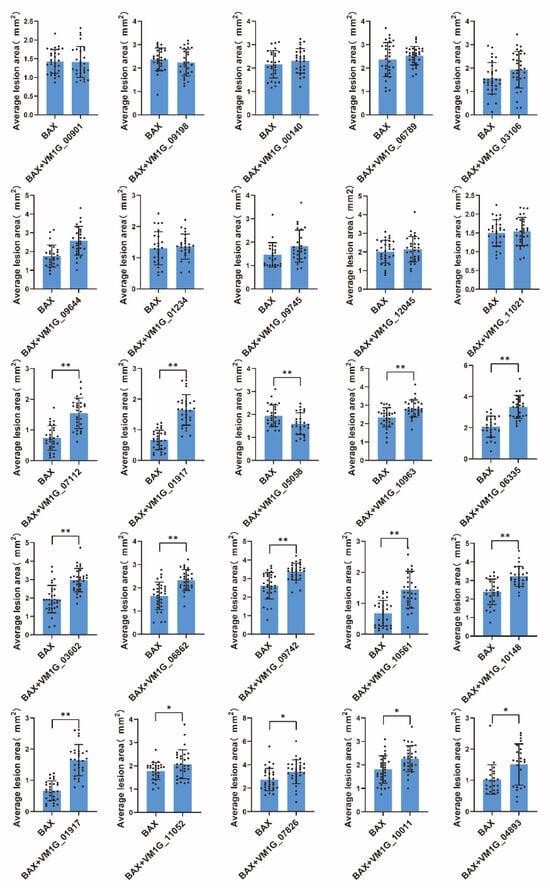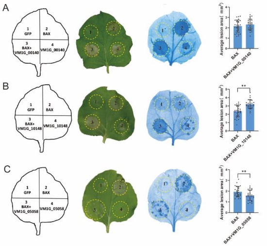 The fungi effector is a molecule that mediates the interaction between the fungus and host cell that often triggers cell death or host defense suppression. However, necrotrophic fungal effectors often induce cell death in the host plant as part of their virulence [27]. In order to examine the function of the anticipated CEPs, a random selection was made of 25 CEPs that displayed differential expression through transcriptomic data analysis. The capacity to initiate cell death or inhibit BAX-induced cell death in N. benthamiana was then tested. The outcomes revealed that 22 out of the 25 chosen CEPs did not demonstrate either cell death induction or the suppression of BAX-induced cell death (Figure 4). In contrast, two CEPs significantly induced cell death in N. benthamiana (Figure 5A,B), while one CEP suppressed BAX-induced cell death (Figure 5C). Of these three CEPs, KUI74483.1 (VM1G-10148) is the PRY2 protein, KUI64965.1 (VM1G_00140) is a hypothetical protein that has homologs in the GenBank NR database, and KUI69830.1 (VM1G-05058) is putative pectate lyase A.