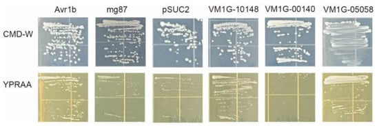 To confirm the secretion of selected CEPs, we used an invertase secretion assay in yeast mutant YTK12 cells [28]. In the vector pSUC2, the signal peptide sequences of three effector candidate genes, VM1G-10148, VM1G-00140, and VM1G-05058, were fused in frame to the mature sequence of yeast invertase [29]. The potential secretory functions of all three candidate effector proteins were indicated by the N-terminal signal peptides they possessed. To serve as a negative control, strains that underwent transformation with the pSUC2 vector exhibited growth solely on CMD-W, while no growth was observed on the YPRAA medium. Conversely, strains harboring the Avr1b signal peptide, employed as the positive control, displayed growth on both CMD-W and YPRAA media. The integration of five effector candidate gene constructs facilitated the growth of the invertase mutant yeast strain YTK12 on YPRAA medium (with raffinose instead of sucrose, and growth only when invertase was secreted) (Figure 6). These results suggested that these two proteins (VM1G-10148, VM1G-05058) were typical secretory proteins; VM1G-00140 may have unique secretory pathways.