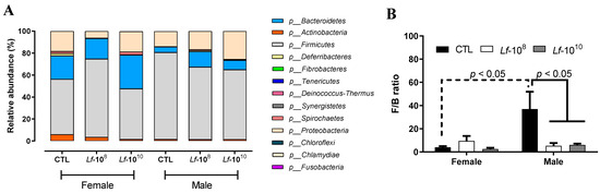 Relative abundance of phylum (A) and Firmicutes/Bacteroides ratio (B) in the gut microbiota of male and female Wistar rats after the administration of Limosilactobacillus fermentum 139, 263, and 296 at different doses for 13 weeks. F/B ratio data are presented as mean ± standard deviation and analyzed using two-way ANOVA. p < 0.05 indicates a significant difference. A dotted line was used to identify significant differences between sex and a solid line was used to identify significant differences in L. fermentum administration. Groups: control group (CTL): PBS (1 mL), L. fermentum receiving a dose of 108 CFU/mL (Lf-108), and L. fermentum receiving a dose of 1010 CFU/mL (Lf-1010).