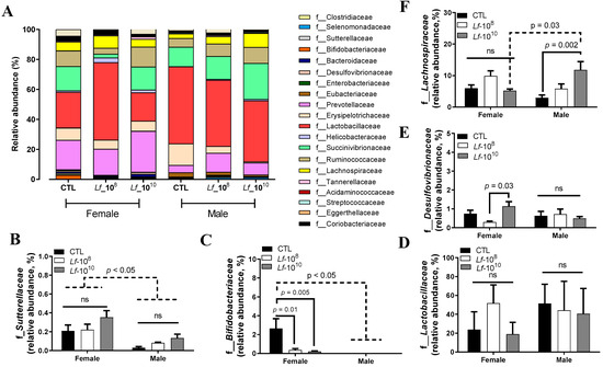 Female rats of all groups had a higher abundance of Sutterellaceae and Bifidobacteriaceae when compared to male rats (p < 0.05, Figure 2B,C). The administration of L. fermentum at 108 or 1010 CFU did not alter the abundance of Sutterellaceae in male and female rats (p > 0.05, Figure 2B). The administration of L. fermentum at 108 or 1010 CFU reduced the relative abundance of Bifidobacteriaceae in female rats (p < 0.05, Figure 2C), but did not change that of Bifidobacteriaceae in male rats (p > 0.05, Figure 2C). The relative abundance of Lactobacillaceae was similar between female and male rats and the administration of L. fermenutm at 108 or 1010 did not alter the relative abundance of Lactobacillaceae in male and female rats (p > 0.05, Figure 2D). The relative abundance of Desulfovibrionaceae was similar between female and male rats (p > 0.05, Figure 2E). Female rats receiving L. fermentum at 1010 CFU had a higher relative abundance of Desulfovibrionaceae than female rats receiving 108 CFU (p < 0.05, Figure 2E). The administration of L. fermentum at 108 or 1010 CFU did not alter the relative abundance of Desulfovibrionaceae in male rats (p > 0.05, Figure 2E). The administration of L. fermentum at 108 or 1010 CFU did not alter the relative abundance of Lachnospiraceae in female rats (p > 0.05, Figure 2F). Male rats receiving L. fermentum at 1010 CFU had a higher relative abundance of Lachnospiraceae than male CTL rats (p < 0.05, Figure 2F). Male rats receiving L. fermentum at 1010 CFU had a higher relative abundance of Lachnospiraceae than female rats receiving the same dose (p< 0.05, Figure 2F).
