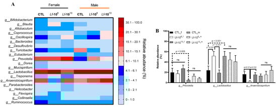 Heat map of the most abundant bacterial genera in male and female Wistar rats after administration of Limosilactobacillus fermentum 139, 263, and 296 at different doses for 13 weeks. Evaluation of the heat map of the most abundant genera (A) in the gut microbiota of male and female rats. Relative abundances of Prevotella, Lactobacillus, and Anaerobiospirillum (B) were analyzed by two-way ANOVA. p < 0.05 indicates a significant difference. A dotted line was used to identify significant difference between sex and a solid line was used to identify significant difference in L. fermentum administration. Groups: control group (CTL): PBS (1 mL), L. fermentum receiving a dose of 108 CFU/mL (Lf-108), and L. fermentum receiving a dose of 1010 CFU/mL (Lf-1010). not significant (ns).