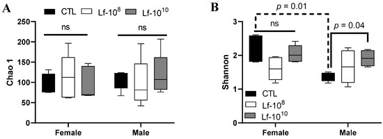 Richness and alpha diversity of male and female Wistar rats after administration of Limosilactobacillus fermentum 139, 263, and 296 at different doses for 13 weeks. Evaluation of the Chao 1 index (A) and Shannon index (B) in in the gut microbiota of male and female rats. Data were analyzed by two-way ANOVA. P < 0.05 indicates a significant difference. A dotted line was used to identify significant difference between sex and a solid line was used to identify significant difference in L. fermentum administration. Groups: control group (CTL): PBS (1 mL), L. fermentum receiving a dose of 108 CFU/mL (Lf-108), and L. fermentum receiving a dose of 1010 CFU/mL (Lf-1010). not significant (ns).