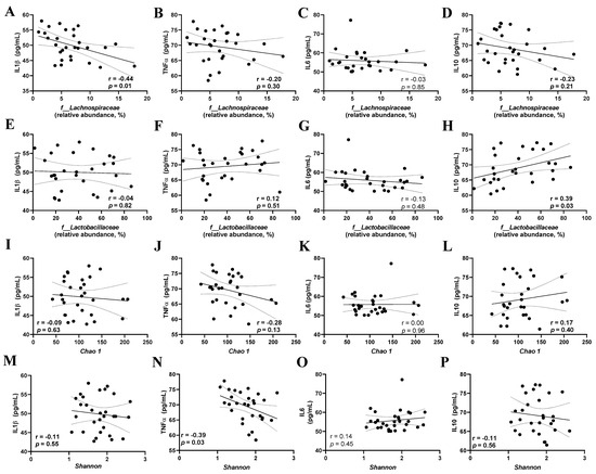 The relative abundance of Lachnospiraceae and Lactobacillaceae and the Chao 1 and Shannon indices were used to assess the correlation between gut microbiota parameters and inflammatory cytokines. The relative abundance of Lachnospiraceae was negatively correlated with IL-1β levels (r = 0.44, p = 0.01, Figure 5A), but not with TNF-α, IL-6, and IL-10 levels (p > 0.05, Figure 5B–D). The relative abundance of Lactobacillaceae was positively correlated with IL-10 levels (r = 0.39, p = 0.03, Figure 5H), but not with IL-1β, TNF-α, and IL-6 levels (p > 0.05, Figure 5E–G). The Chao 1 index did not correlate with IL-1β, TNF-α, IL-6, and IL-10 levels (p > 0.05, Figure 5I–L). The Shannon index was negatively correlated with TNF-α levels (p < 0.05, Figure 5N), but not with IL1β, IL-6, and IL-10 levels (p > 0.05, Figure 5M,O,P).