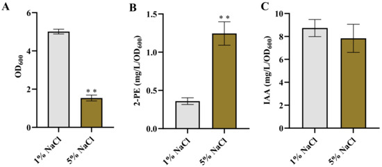 The growth and production of 2-PE and IAA in Enterobacter sp. CGMCC 5087 under osmotic stress. (A) The growth of Enterobacter sp. CGMCC 5087 under 1% or 5% NaCl stress conditions at 24 h. (B) The effect of 5% NaCl on production of 2-PE. The concentration of 2-PE was measured under normal (1%) or 5% NaCl stress at 24 h. (C) The effect of 5% NaCl on production of IAA. The concentration of IAA was measured under normal or 5% NaCl stress at 24 h. The data shown are means ± SD (n = 3). Significant differences were analyzed by two-sample t-test, and p < 0.05 was considered statistically significant. ** p < 0.01.