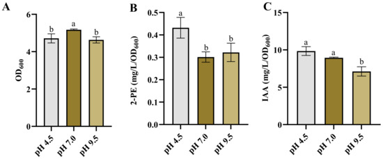 The growth and production of 2-PE and IAA in Enterobacter sp. CGMCC 5087 under different pH. (A) The growth of Enterobacter sp. CGMCC 5087 under pH 4.5, pH 7.0, and pH 9.5 stress conditions at 24 h. (B) The effect of pH 4.5, pH 7.0, and pH 9.5 on production of 2-PE. The concentration of 2-PE was measured under pH 4.5, pH 7.0, or pH 9.5 at 24 h. (C) The effect of pH 4.5, pH 7.0, and pH 9.5 on production of IAA. The concentration of IAA was measured under pH 4.5, pH 7.0, or pH 9.5 at 24 h. The data shown are means ± SD (n = 3). Different letters a and b indicate a statistically significant difference (Duncan’s multiple range test, p < 0.05).