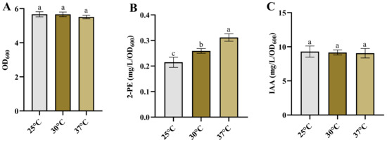 The growth and production of 2-PE and IAA in Enterobacter sp. CGMCC 5087 under different temperature. (A) The growth of Enterobacter sp. CGMCC 5087 under 25 °C, 30 °C, and 37 °C conditions at 24 h. (B) The effect of 25 °C, 30 °C, and 37 °C on production of 2-PE. The concentration of 2-PE was measured under 25 °C, 30 °C, and 37 °C conditions at 24 h. (C) The effect of 25 °C, 30 °C, and 37 °C on production of IAA. The concentration of IAA was measured under 25 °C, 30 °C, and 37 °C conditions at 24 h. The data shown are means ± SD (n = 3). Different letters a to c indicate statistically significant difference. Same letters indicate statistically insignificant difference (Duncan’s multiple range test, p < 0.05).