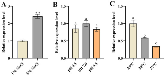 The expression of KDC4427 under different stress conditions. (A) The expression of KDC4427 under 1% NaCl and 5% NaCl stress conditions. Significant differences were analyzed by two-sample t-test, and p < 0.05 was considered statistically significant; ** p < 0.01. (B) The expression of KDC4427 under pH 4.5, pH 7.0, and pH 9.5 stress conditions. (C) The expression of KDC4427 under 25 °C, 30 °C, and 37 °C conditions. The data shown are means ± SD (n = 3). Different letters a to c indicate statistically significant difference. Same letters indicate statistically insignificant difference (Duncan’s multiple range test, p < 0.05).