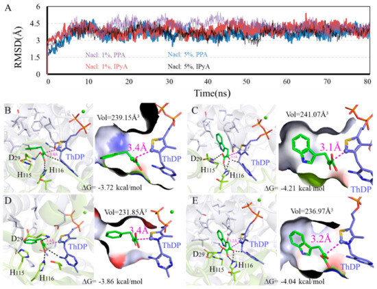 To explore how the different conditions affect the enzyme activity of KDC4427, the detailed interactions between KDC4427 and PPA or IPyA, molecular modeling, and molecular docking analysis were conducted and systematically analyzed. The modeling structure and binding modes of KDC4427/PPA or KDC4427/IPyA are shown in Figures S1 and S2. > 90 ns MD simulations under different NaCl, pH, and temperature conditions were performed to investigate the structure differences of KDC4427-PPA and KDC4427-IPyA complexes in the physicochemical environment. Given the geometry of catalytic center, binding free energies, binding cavity volume, and the distance dαC-C- between αC atom (PPA and IPyA) and C-atom (ThDP) were monitored to quantify the subtle variations in catalytic activities. The in silico predictions and binding modes of influence under these different conditions and corresponding catalytic activities are collected in Figure 5, Figure 6 and Figure 7.