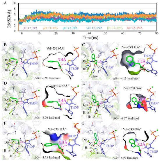 Binding modes difference of KDC4427 with the substrates PPA or IPyA at different pH values (4.5, 7.0, and 9.5). (A) Average structure of KDC4427/PPA or KDC4427/IPyA at different pH content was extracted from 80 ns MD simulations. (B) Interaction of KDC4427/PPA at pH 4.5. (C) Interaction of KDC4427/IPyA at pH 4.5. (D) Interaction of KDC4427/PPA at pH 7.0. (E) Interaction of KDC4427/IPyA at pH 7.0. (F) Interaction of KDC4427/PPA at pH 9.5. (G) Interaction of KDC4427/IPyA at pH 9.5. The distance dαC-C- between αC atom (PPA and IPyA) and C- atom (ThDP) was measured and colored by magenta dashed line. Hydrogen bond was denoted by black dashed line.