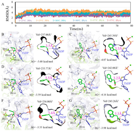 As shown in Figure 7A, the systems all reached equilibrium after 15 ns, and binding modes analysis revealed that PPA and IPyA can be buried into the binding cavity in geometric configurations with −4.16~−3.33 kcal/mol binding free energy. The smaller size for PPA hastened flexible conformations to the binding cavity, resulted a decrease in binding affinities (25 °C: −3.60 kcal/mol, 30 °C: −3.59 kcal/mol, and 37 °C: −3.33 kcal/mol), and collapsed the binding cavity (25 °C: 237.00Å3, 30 °C: 233.77Å3, and 37 °C: 236.00Å3) (Figure 7B,D,F). Although the PPA at 37 °C owns the lowest binding affinity -3.33 kcal/mol, it possesses the shortest dαC-C- distance value of 3.4 Å. Thus, KDC4427 presents better catalytic efficiency to PPA at 37 °C, which is consistent with the experimental data. Under temperatures of 25 °C and 30 °C, the hydrogen bonds network with residues H116 and D29 was observed in the binding pocket and relatively intense binding patterns (−4.07 kcal/mol and −4.16 kcal/mol) were observed for IPyA (Figure 7C,E). The loose interaction occurred at temperature 37 °C as the binding affinity, cavity volume, and distance dαC-C- for IPyA reached −3.98 kcal/mol, 243.26 Å3, and 3.3 Å, respectively (Figure 7G). Despite different binding affinity and geometric characteristics, the enzyme also exhibited better catalytic capability to IPyA under a 30 °C environment. However, our results indicated that temperatures ranging from 25 to 37 °C had no impact on the synthesis ability of IAA. This suggested that, in addition to the involvement of KDC4427 in the synthesis, other regulatory mechanisms also played a collective role in influencing the synthesis of IAA.