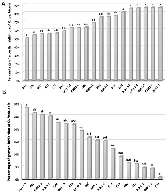 We conducted two distinct yet complementary assays to evaluate the antagonistic impact of the 18 bacteria against C. beticola. In the confrontation assay on PDA medium, all of the isolates demonstrated significant (F = 4.340; p < 0.001) growth inhibition of more than 50%, compared to the control (Figure 1A). Notably, six isolates (BGH2-2, BGH2-5, BGH1-6, BGH 1-3, BGH 2-7, and G3d) exhibited a growth inhibitory effect exceeding 80%.