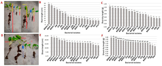 Similarly, ANOVA showed a highly significant effect (F = 12.40; p < 0.0001) of rhizosphere bacteria on the weight of the sugar beet shoots. The Duncan test grouped the effect of the bacteria into several categories (Figure 2F). Six bacteria (BGH4-1, BGH1-5, BGH2-1, BGH2-7, G1B, and BGH1-6) induced an increase of more than 50% in the weight of the shoots, ranked from highest to lowest.