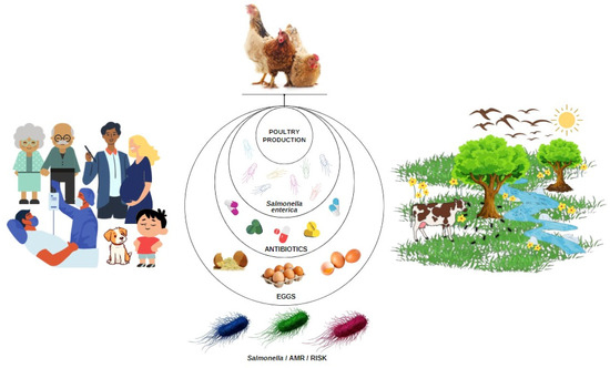 Representation of interactions between layer production system, presence of antibiotic-resistant Salmonella enterica, environment, consumers, and consumption of eggs and by-products as a scenario of the risk of antibiotic resistance (AMR) for One Health.