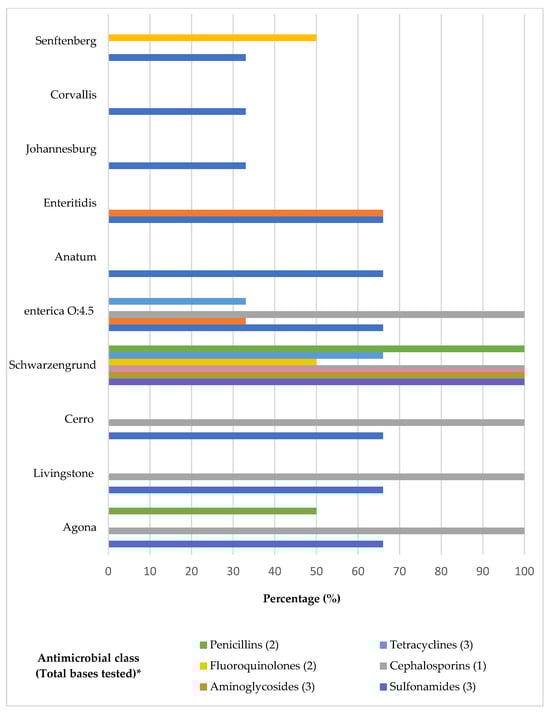 Distribution of Salmonella serovars resistant to antibiotic classes. * Tested bases of each antibiotic class: Penicillins (Amoxicillin clavulanic acid, Ampicillin); Fluoroquinolones (Enrofloxacin; Ciprofloxacin); Aminoglycosides (Gentamicin, Neomycin, Apramycin); Tetracyclines (Tetracycline, Oxytetracycline, Doxycycline); Cephalosporins (Ceftiofur); Sulfonamides (Sulfamethoxazole, Trimethoprim-sulfamethoxazole, Sulfonamides).