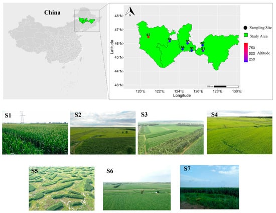 To increase sample size and representativeness, we combined 67 samples from 5 sampling sites (Dataset 1) and 27 samples from 2 sampling sites (Dataset 2) for overall analysis. The samples in Dataset 1 were collected from July to August 2020, and the locations of the five sites were: Dongsheng Village, Nangang District, Harbin City, Heilongjiang Province, China (S1: 45°57′ N, 126°48′ E, elevation 182 m, N = 10); Wanbao Town, Harbin City, Heilongjiang Province, China (S2: 45°87′ N, 126°37′ E, elevation 120 m, N = 24); Minzhu Village, Zhaoyuan County, Daqing City, Heilongjiang Province, China (S3: 45°50′ N, 125°31′ E, elevation 124 m, N = 15); Xinzhan Town, Zhaoyuan County, Daqing City, Heilongjiang Province, China (S4: 45°59′ N, 124°37′ E, elevation 139 m, N = 10); and Datong District, Daqing City, Heilongjiang Province, China (S5: 46°01′ N, 124°88′ E, elevation 132 m, N = 8). The samples in Dataset 2 were collected from July to August 2021 from two locations: Tumuji Town, Zhalaite Banner, Hinggan League, Inner Mongolia Autonomous Region, China (S6: 46°01′ N, 124°88′ E, elevation 160 m, N = 11), and Wuchagou Town, Arxan City, Hinggan League, Inner Mongolia Autonomous, China (S7: 46°01′ N, 124°88′ E, elevation 838 m, N = 16) (Table S1, Supplementary Materials; Figure 1). In both datasets, the collection and preservation methods for all the samples remained consistent. Detailed descriptions of the methods can be found in Wu et al. (2024) []. Specifically, in the northern agro-pastoral transitional zone of China, we established eight survey grids measuring 100 km × 100 km, each containing two sampling points. Among these points, we successfully captured individuals of A. agrarius at the seven locations previously mentioned. The distances between the survey sites exceeded 30 km. The samples were collected in July and August of 2020 (Dataset 1) and July and August of 2021 (Dataset 2).
