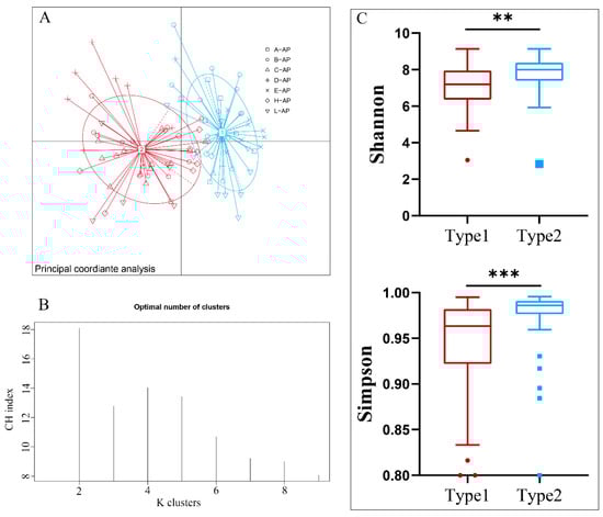 Identification and clustering analysis and alpha diversity of two enterotypes of A. agrarius. (A) Principal coordinate analysis (PCoA) plots based on Bray–Curtis dissimilarity metrics. (B) K-means partitions comparison and Calinski–Harabasz values calculation. The highest Calinski–Harabasz values indicate optimal clusters. (C) Mann–Whitney U test was used to test the differences of Shannon index and Simpson index between 2 types. Significant difference is indicated by ** p < 0.01, *** p < 0.001.