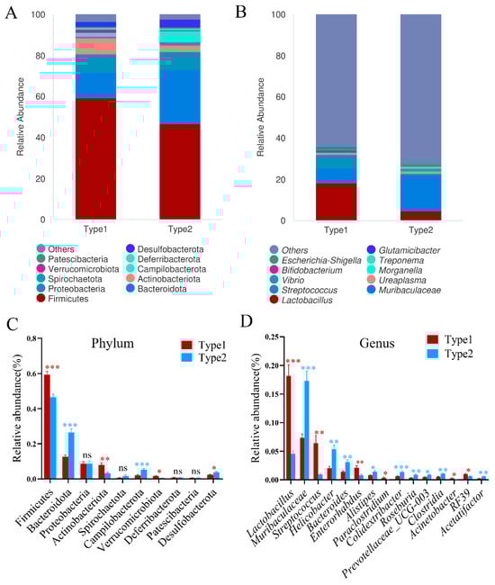 Taxonomic composition of 2 community types in A. agrarius. (A) Phyla level. (B) Genus level. (C,D) One-way with Tukey’s post hoc test was taken to test the compositional differences of 2 enterotypes at phyla and genus level. Significant difference is indicated by * p < 0.05, ** p < 0.01, *** p < 0.001, ns represents no significance.