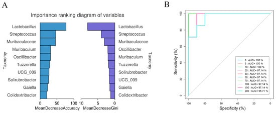 Representation of bacterial genera among sequence variants most informative in species-classification Random Forest Classifier (RFC) models. (A) The histogram is a ranking chart of the importance of variables. In the Accuracy chart, the horizontal coordinate represents the average declining accuracy, and the vertical coordinate is the top 10 important species. The Gin chart shows the average decline in the Gini index on the horizontal axis and the top 10 important species on the vertical axis. (B) The ROC curve serves as a measure to assess the credibility of random forest models established under varying feature counts (3, 5, 10, 30, 50, 70, 100, 150, and 200), with the false positive (Specificity) rate on the horizontal axis and the true positive (Sensitivity) rate on the vertical axis. Larger areas under the curve (AUC) indicate better model discrimination ability.