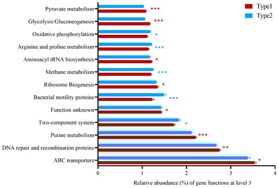 The results of microbial gene function prediction showed that the functions of the microbial genes of A. agrarius were mainly concentrated in metabolism (Type1: 46.8%, Type2: 46.6%), genetic information processing (Type1: 19.1%, Type2: 18.9%), and environmental information processing (Type1: 15.4%, Type2: 14.9%) (Table S2, Supplementary Materials). At KEEG level 2, 11 predicted gene functions (i.e., membrane transport, carbohydrate metabolism, and nucleotide metabolism) were more abundant in Type1, while 14 predicted gene functions (i.e., energy metabolism, energy metabolism, and energy metabolism) were enriched in Type2 (Table S3, Supplementary Materials). At KEEG level 3, a total of 210 gene functions were significantly different between the 2 enterotypes. These results indicated that these two clusters had significantly different functions. Among these functional genes with a relative abundance of more than 1%, functions such as ABC transporters, DNA repair and recombination proteins, purine metabolism, function unknown, ribosome biogenesis, aminoacyl tRNA biosynthesis, glycolysis/gluconeogenesis, and pyruvate metabolism were significantly enriched in Type1, while those functions like the two-component system, bacterial motility proteins, methane metabolism, arginine and proline metabolism, and oxidative phosphorylation were enriched in Type2 (Figure 5). These results indicate that the gut microbiota of A. agrarius plays an important role in metabolic function and has different degrees of enrichment in different enterotypes.