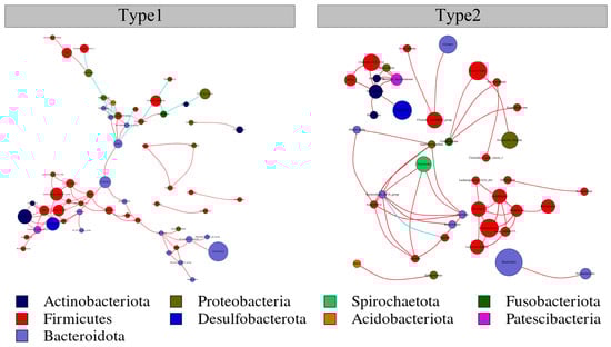 Metacommunity networks of 2 community types in A. agrarius based on Spearman’s correlation analysis. A connection between nodes indicates a strong (Spearman’s r > 0.6) and significant (FDR-corrected p value < 0.05) correlation. Co-occurrence networks for Type1 and Type2 are shown. The size of each node is proportional to the degree of the ASVs. The red links of 2 nodes represent positive correlation, and the blue links of 2 nodes represent negative correlation.